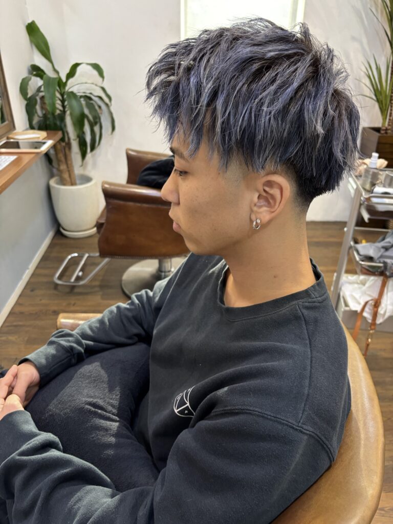 ホワイトメッシュは難しいもので、シャンプー中にベースのブルーブラックが少し流れてついてしまう事もあるですが、2.3日シャンプーしていただければ落ちてきますので、色落ちも楽しみつつでよければやってみてください😊