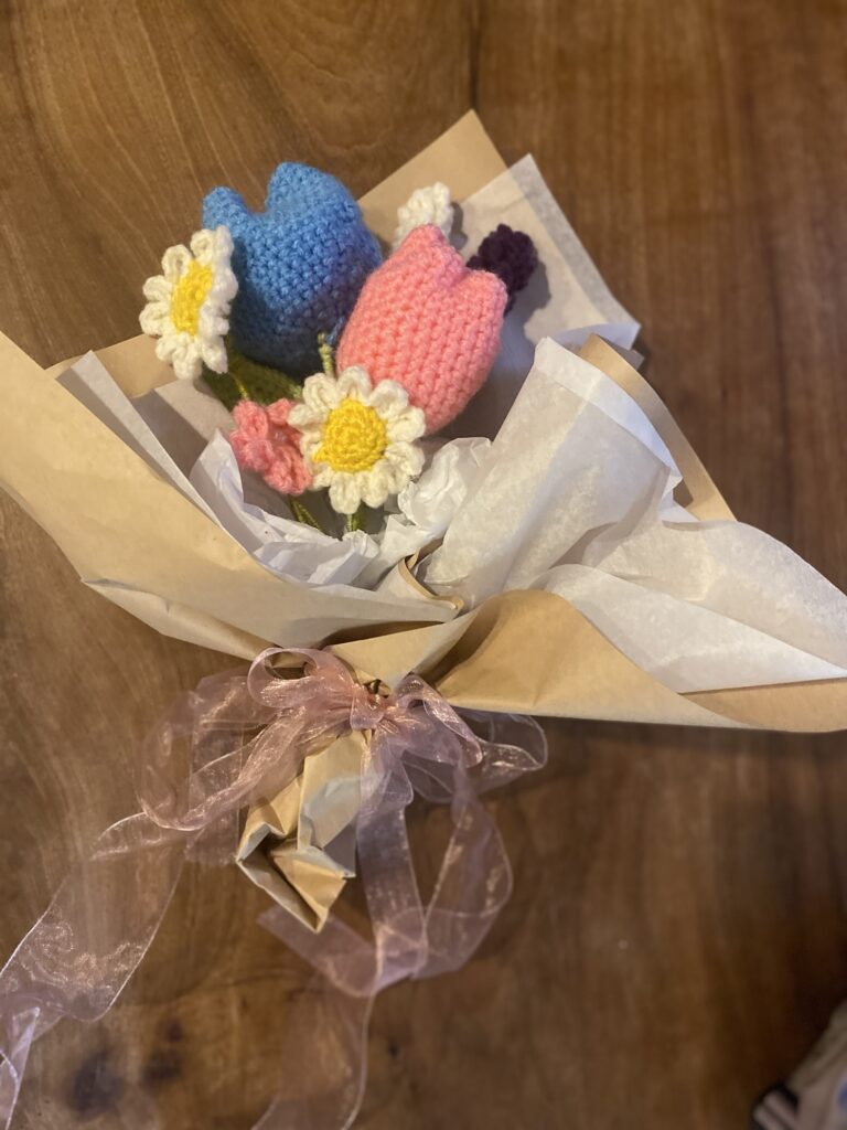 皆さまこんにちは デザイン店のさおりです。 季節の変わり目、生活も変化がある方も多い季節ですね。 先日、高校生の娘が先輩に送った 編み物の花束💐です。 今はこう言うのが流行っているのですね。 娘の行動を見ていると 若い人達のトレンドが見えてくる良いモデルです。 しつこく聞くとご機嫌斜めになりますので、 ひっそりと観察しております笑