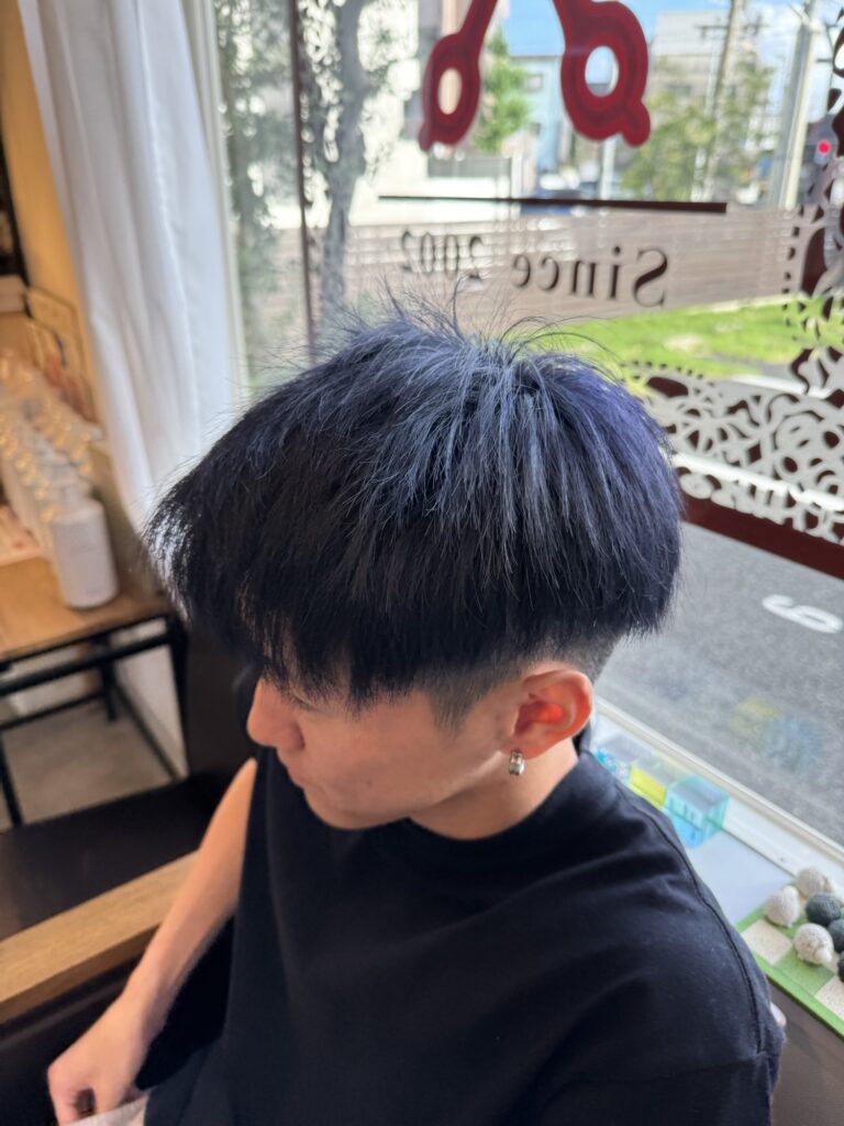 こんにちは!メンズスタイリストの高須です!! 最近ブリーチをして髪を特別明るくされるお客様が増えています!! 今回のお客様はブリーチ1回したところにブルーブラックを入れました!! ブルーブラックはブリーチなしでも可能な色ですが、ブリーチをしていると発色がよく、青みを特に出したい方にオススメです!! 最近暑くスパイキーショートなどにされるお客様も増えていますが、短髪とブリーチで髪を明るくする組み合わせは最強なのでこの夏はとてもオススメです!!